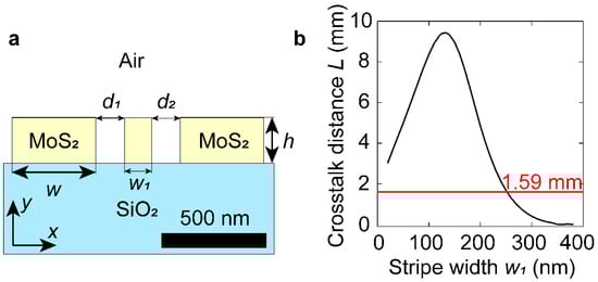 Next, we try to reduce the crosstalk by placing a single stripe between the waveguides. Since, in practice, waveguides are produced from a planar layer by lithography [36,37], we assume that the stripe height and material composition are identical to the waveguides. It is also worth noting that structure has reflection symmetry; hence, stripes need to be placed symmetrically to achieve the best performance. Therefore, a single stripe should be located in the center between waveguides, as shown in Figure 2a. Figure 2b shows the crosstalk distance as a function of the stripe width w1. The maximum is reached at w1 = 130 nm, with the corresponding L1 = 9.4 mm, which is almost 6-times greater than for the initial configuration without the stripe (Figure 1a). For comparison, silicon waveguides with the same original crosstalk distance have L0 = 1.57 mm (without a stripe) and L1 = 3.16 mm (with a single optimized strip). It implies a several-times enhancement in crosstalk distance for MoS2, compared to silicon. We attribute this fact to the high refractive index (n ~ 4) of MoS2. High refractive index allows for a higher effective mode index of the fundamental mode. It also enhances the effective anisotropy of combined air/MoS2 spacing between waveguides, contributing to the total internal reflection and the decay of the evanescent field outside the waveguides [18,19,20,21,22]. At the same time, giant intrinsic optical anisotropy of MoS2 does not lead to a decrease in the effective mode index since the electric field in TE mode is mainly directed parallel to the atomic planes of MoS2 and, therefore, is weakly influenced by the low out-of-plane component of the refractive index.