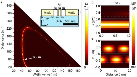 Aiming to further decrease waveguide crosstalk, we study the effect of insertion of two stripes between waveguides on the crosstalk distance. We computed a 2D heatmap (Figure 3) of crosstalk distance as a function of stripe width w1 = w2 (equality required by reflection symmetry) and stripe separation d2 (see the inset in Figure 3). Note that the map is triangular because parameters should satisfy d1 + d2 + d3 + w1 + w2 = 400 nm, equal to the initial gap between waveguides (inset in Figure 3). The absolute maximum in Figure 3 corresponds to L2 = 6.9 m, achieved at w1 = w2 = 44 nm and d2 = 59 nm. Of immediate interest is the significant ratio of L2/L1 ≈ 750 for MoS2. For comparison (Table 1), in the case of uniform stripes (w1 = w2 = d2 = 46 nm), L2/L1 ≈ 100, which is still, by an order of magnitude, higher than for silicon with L2/L1 ≈ 5 [23]. Therefore, our inverse design analysis demonstrates that TMDCs, in particular MoS2, provide an order-of-magnitude-higher integration circuit performance, in our case crosstalk distance, than silicon, despite only 15% higher refractive index.