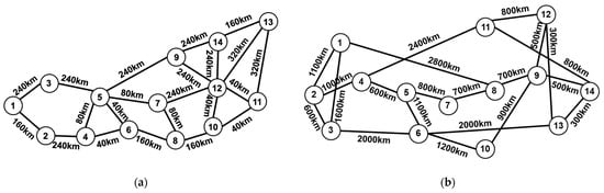 where is the launch power of the lightpath, is the amplified spontaneous emission (ASE) noise power introduced by erbium-doped fiber amplifiers (EDFAs), and is the NLI power due to the nonlinear effect of fibers. The Japan network (Jnet) and National Science Foundation network (NSFnet) are considered in our simulations, which are shown in Figure 2a,b, respectively. The transponders of the two networks are set to work on the C++ band of which the center frequency is 193.35 THz with a spectral load with 80 wavelengths (i.e., channels) on the 50 GHz spectral grid. The symbol rate of the transponders is 32 GBaud, and the launch power of each channel is uniformly selected in the range of [−3~0] dBm with 0.1 dBm granularity. We assume the fibers in the two networks are ITU-T G.652 standard single-mode fibers (SSMF), of which attenuation, dispersion, and non-linearity coefficients are 0.2 dB/km, 16.7 ps/nm/km, and 1.3/W/km, respectively; the span length of the fibers is 40 km in the Jnet and 100 km in the NSFnet. The EDFas in the two networks are set to completely compensate for fiber span losses, and the noise figure is 8 dB in the Jnet and 6.5 dB in the NSFnet. The network datasets of the two networks are generated synthetically by the open-source Gaussian noise model in the Python (GNPY) library [], where the NLI power is calculated by the generalized Gaussian model (GNN). In each network, we generate 8000 samples for training and 2000 samples for testing by randomly choosing one of the K shortest paths of a source–destination node pair and a channel state that represents whether the channels are occupied. The training datasets in the Jnet and NSFnet are defined as and , and the testing datasets in the Jnet and NSFnet are defined as and . Each sample of the network dataset contains the launch power of each channel, the wavelength allocation, the transmission length, and the GSNR of each channel.