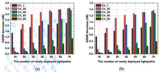 Figure 3a,b show the GSNR decrease of the Ch_1, Ch_20, Ch_40, Ch_60, and Ch_80 caused by the deployment of the new lightpaths in the Jnet and the NSFnet. In the Jnet and the NSFnet, the selected routes are 1-3-5-9-14-13 and 2-4-11-12, respectively, and the wavelength assignment scheme is the first-fit (FF). In Figure 3a, with the increase in the number of newly deployed lightpaths, the GSNR decrease of the CUTs increases and the maximum GSNR decrease achieves 3.25 dB. Moreover, due to the FF scheme, the GSNR of the channel with the smallest number (Ch_1) decreases the most when the number of newly deployed lightpaths is 10, and when the number of newly deployed lightpaths achieves 70, the GSNR of the channel with the middle number (Ch_40) decreases the most. In Figure 3b, the performance of the GSNR decrease in the NSFnet is similar to that in the Jnet, and the maximal GSNR decrease of the CUTs is 1.36 dB. The QoT of the previously deployed lightpaths is deteriorated greatly due to the deployment of new lightpaths, and the QoT estimation of the single lightpath cannot capture the decrease in the previously deployed lightpaths’ QoT. Thus, it is necessary to estimate the QoT of new-LPs and pre-LPs simultaneously, i.e., achieve multi-channel QoT estimation, in optical networks.