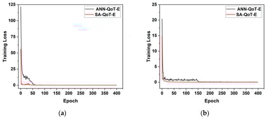 (a) Training loss vs. the number of epochs for the ANN-QoT-E and the SA-QoT-E in the Jnet; (b) training loss vs. the number of epochs for the ANN-QoT-E and the SA-QoT-E in the NSFnet.