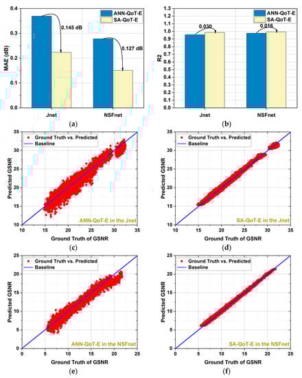 Estimation accuracy of the ANN-QoT-E and the SA-QoT-E: (a) testing MAE of two models in the Jnet and NSFnet; (b) testing R2 of two models in the Jnet and NSFnet; (c) ground truth of GSNR vs. predicted GSNR based on the ANN-QoT-E in the Jnet; (d) ground truth of GSNR vs. predicted GSNR based on the SA-QoT-E in the Jnet; (e) ground truth of GSNR vs. predicted GSNR based on the ANN-QoT-E in the NSFnet; (f) ground truth of GSNR vs. predicted GSNR based on the SA-QoT-E in the NSFnet.