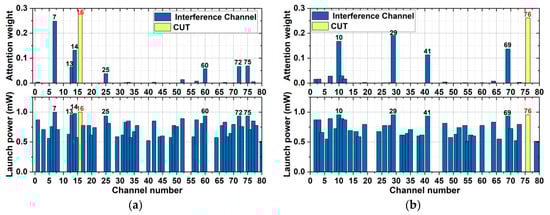 In the Jnet and the NSFnet, the accuracy of the SA-QoT-E is higher than that of the ANN-QoT-E, which is because the self-attention mechanism assigns weights to the interfering channels according to their effects on the QoT of CUT. Figure 6a,b show the attention weight and launch power of each channel for Ch_16 in the Jnet and for Ch_76 in the NSFnet, respectively, which is tested by the SA-QoT-E on a randomly selected testing sample. Due to the nonlinear effect of fibers, the interfering channel, which has a higher launch power and closer spectral distance to the CUT (SDC), has a stronger effect on the CUT. Figure 6a marks the channels with the larger attention weight. In the Jnet, as shown in Figure 6a, these marked channels are arranged in descending order of attention weight as Ch_16, Ch_7, Ch_14, Ch_75, Ch_72, Ch_13, Ch_60, and Ch_25. The attention weight of Ch_16 is maximal due to its launch power being maximal and SDC being minimal. Though the SDC of Ch_7 is higher than that of Ch_14, the attention weight of Ch_7 is higher than that of Ch_14 due to the higher launch power of Ch_7. The attention weights assigned for Ch_13, Ch_25, Ch_60, Ch_72, and Ch_75 violate the nonlinear effect theory; thus, the accuracy of the SA-QoT-E in the Jnet is lower than that in the NSFnet. Figure 6b shows that, in the NSFnet, the order of the marked channels according to their attention weight is Ch_76, Ch_29, Ch_10, Ch_69, and Ch_41. The attention weight of Ch_76 is maximal due to the maximal launch power and minimal SDC of Ch_76, and the attention weight of Ch_29 and Ch_10 is higher than that of Ch_69 and Ch_41, which is because the launch power of Ch_29 and Ch_10 is higher than that of Ch_69 and Ch_41. Due to the smaller SDC of Ch_29 than Ch_10, the attention weight of Ch_29 is higher than that of Ch_10. For the same reason, the attention weight of Ch_69 is higher than that of Ch_41. The attention weights assignment in the NSFnet obeys the nonlinear effect theory.