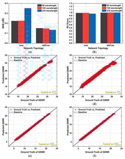 Estimation accuracy of the SA-QoT-E in the Jnet and NSFnet with different numbers of wavelengths: (a) testing MAE of the SA-QoT-E in the Jnet and NSFnet; (b) testing R2 of the SA-QoT-E in the Jnet and NSFnet; (c) ground truth of GSNR vs. predicted GSNR based on the SA-QoT-E in the Jnet with 120 wavelengths; (d) ground truth of GSNR vs. predicted GSNR based on the SA-QoT-E in the Jnet with 216 wavelengths; (e) ground truth of GSNR vs. predicted GSNR based on the SA-QoT-E in the NSFnet with 120 wavelengths; (f) ground truth of GSNR vs. predicted GSNR based on the SA-QoT-E in the NSFnet with 216 wavelengths.
