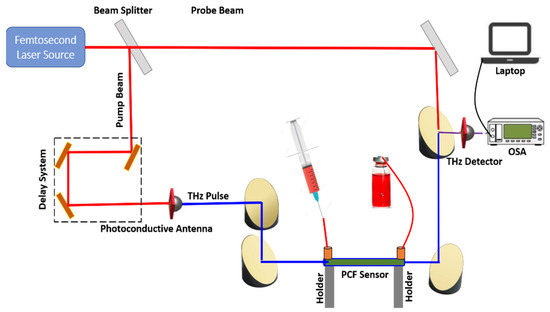 Secondly, the pump beam was incident on a photoconductive antenna (THz emitter) to emit the THz pulse. A system of parabolic mirrors was used to align and synchronize the THz beam onto the PCF core region, where two irises were used to fix the sensor. The blood samples with different bilirubin concentrations could be selectively infiltrated inside the core region using a hypodermic syringe based on the capillary action. The syringe was used to infiltrate the analyte into the core through the face opposite to the blocked end. The solution could be slowly fed from the hypodermic syringe to ensure that the analyte sample did not enter the fiber cladding [42]. The syringe did not affect the core’s refractive index, because it was removed immediately after the filling process. Injection of the UV-cured polymer was used to block the cladding holes and keep the central core hole open [43]. In addition, femtosecond laser micromachining could be used to block all the air holes using a section of conventional single mode fiber. Then, femtosecond laser direct drilling was used to open the selected holes through the blocked end [43]. In addition, the cladding holes could be blocked by selective sealing with molten uncured polymer. Then, analyte was infiltrated into the unsealed holes via capillary effects [44]. The transmitted THz beam could be realigned and refocused onto the photoconductive THz detector. The probe beam met the detector to measure the incident electric field with amplitude attenuation and time delay based on the THz pulse absorption of bilirubin. A delay unit was used to offset the pump and probe pulses and helped in the THz temporal analysis. A Fourier transform was then used to convert the time-domain spectroscopy into a frequency domain spectrum. The blood refractive index variation modulated the intensity of the transmitted optical power. The intensity modulation could be analyzed by the optical spectrum analyzer (OSA), and the output could be investigated using the computer to obtain the performance parameters, such as sensitivity and CL. The computer represented the data both numerically and graphically. The cutback method and external lenses were used to eliminate the coupling loss that resulted from the lateral misalignment of the system [45]. Currently, modern technologies overcome the THz gap in the sources, detectors, and coupling devices by developing an efficient device [46].