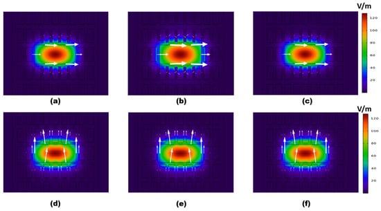 The electric field distribution of the fundamental mode for the (a–c) x-polarized mode and the (d–f) y-polarized mode at f = 0.75 THz, C = 4, 8, and 12 µmol/L, respectively. The initial dimensions shown in Table 1 are used.