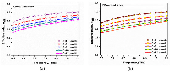 Figure 4 shows the variation of the effective index with the frequency for both the x- and y-polarized modes at different bilirubin concentrations. It may be seen that the effective index increased as the operating frequency increased. This was due to the good confinement of the mode through the high index core at large frequencies. Moreover, as the concentration of bilirubin increased, the refractive index of the analyte sample decreased. Therefore, the effective index of the supported modes decreased by increasing the bilirubin concentration [49]. The difference in the effective index between the x- and y-polarized modes was due to the asymmetrical structure of the core rectangular air hole [50,51].