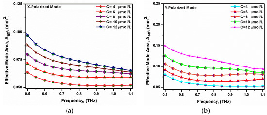 where E denotes the transverse electric field intensity. Figure 6 shows the variation in the effective mode area with the frequency at different bilirubin concentrations. It may be seen that the effective mode area decreased with the increasing operating frequency. This was due to the electric field being more confined through the analyte by increasing the frequency [59,60]. It was also noted that the effective mode area increased with a decreasing refractive index of the analyte (i.e., increasing the bilirubin concentration). For lower indexed analyte, the light confinement through the core region will be reduced [61]. The obtained effective mode areas were 0.0526 mm2 and 0.0551 mm2 for the x-polarized mode and y-polarized mode, respectively, at f = 0.75 THz.