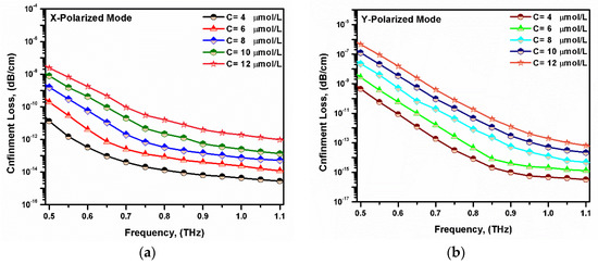 where f, c, and neff are the operating frequency, speed of light in a vacuum, and the effective index of the studied mode, respectively. Figure 7 shows the variation in the confinement loss of the suggested sensor with the operating frequency. It was noted that the confinement loss decreased with the increasing frequency. Moreover, the confinement loss decreased by decreasing the bilirubin concentrations. This was owing to the well confinement through the core region at higher frequencies. As the bilirubin concentration increases, the analyte refractive index will decrease. Therefore, a low index contrast between the core and cladding region occurs with reduced light confinement in the core region. The proposed sensor had very low confinement loss values of 2.05 × 10−14 dB/cm and 8.204 × 10−15 dB/cm for the x- and y-polarized modes, respectively, at f = 0.75 THz.