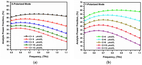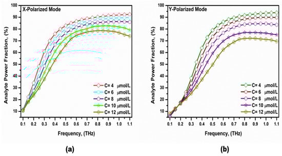 where η is the power fraction, and Sz is the z-component of the Poynting vector. Figure 8 shows the variation in the analyte power fraction versus the frequency. It was noted that the power fraction in the analyte region increased with the increase in the operating frequency to 0.6 THz and then started to decrease. The reason behind that is the light with a higher frequency tries to propagate through the higher refractive indexed material. Therefore, some light leaks through the background material [52,64,65]. The power fraction also increased as the bilirubin concentration decreased, which increased the analyte refractive index [61]. This will increase the index contrast seen by the two polarized modes with better confinement in the core region. The maximum power fraction within the analyte region of the x- and y-polarized modes were 54.82% and 59.74%, respectively, at f = 0.75 THz.