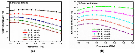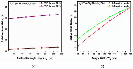In order to maximize the sensitivity of the proposed sensor, the optimization of the different geometrical parameters was performed. The variation in the relative sensitivity of both polarized modes with the core length (La) is first presented in Figure 10a, while the other parameters were kept constant at their initial values. However, the variation in the relative sensitivity of both polarized modes with the core width (Wa) is shown in Figure 10b at f = 0.75 THz and C = 4 µmol/L. It is revealed from Figure 10 that the relative sensitivities of the two polarized modes increased by increasing the studied parameters. This was due to the increase in the analyte area, which increased the core power fraction [60,66]. It is also worth noting that the geometrical parameters were chosen for the ease of fabrication. Therefore, La = 377 µm and Wa =124 µm were chosen for the suggested design. It is also evident that the relative sensitivity of the y-polarized mode was better than that of the x-polarized mode. This was due to the core power fraction of the y-polarized mode being greater than that of the x-polarized mode [58,61].