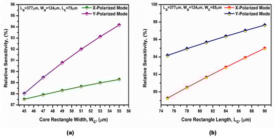 The variation in the relative sensitivity of both polarized modes with the cladding rectangular hole width (Wc) is presented in Figure 11a, at Lc = 75 µm. Furthermore, the variation in the relative sensitivity of both polarized modes with the cladding rectangular hole length (Lc) is shown in Figure 11b, at Wc = 55 µm. As the studied parameters increased, the air cladding regions increased, which increased the index contrast between the core and cladding regions. Therefore, the filed confinement of the two polarized modes in the core region increased. Hence, the relative sensitivity was increased by increasing the studied parameters, as shown in Figure 12. In the next study, Wc = 55 µm and Lc = 90 µm were taken for the subsequent simulations. A maximum relative sensitivity of 95% and 98% were obtained for the x-polarized and y-polarized modes at the optimized geometrical parameters listed in Table 2. It should be noted that during the fabrication process, the minimum distance between the holes must not be smaller than 4 µm [53,67] due to the possible fluctuations of the geometrical parameters during the fabrication process.