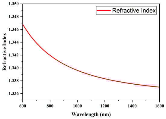 Equation (4) is used to calculate the refractive index by the concentration of water and Albumin. If the water concentration or albumin concentration changes, the refractive index of plasma also changes. The Cauchy equation calculates the refractive index of plasma is given in Equation (5) []