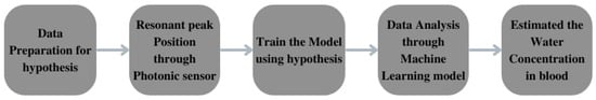Human blood is made up primarily of water. Water is significantly involved in balancing the human body. It affects the component of blood like mean corpuscular hemoglobin (MCH), mean corpuscular hemoglobin concentration (MCHC), and mean platelets volume (MPV). The water concentration varies from 80 to 90% in blood. The change in water concentration changes the refractive index of plasma, and the change in the refractive index of plasma also changes the refractive index of blood. The proposed structure is designed to analyze the water concentration in human blood by analyzing the shifting in resonant peak and this shifting is processed by machine learning algorithm to estimate the concentration of water in human blood. Nanocavity ring structures in the waveguide region are designed as sensing nodes in this proposed structure. The air hole radius of these Nanocavity ring structures is 80 and 50 nm, whereas the proposed structure’s dimension is 12.15 by 8.45 μm2. The sensitivity of the design structure is 570 nm/RIU, and the quality factor is 650. The structure is simulated through the Finite Difference Time Domain (FDTD) method.