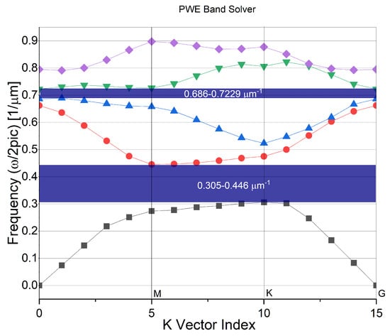 where a is the lattice constant and f is the region’s frequency where the bandgap exists. Figure 3 shows the photonic bandgap of the design structure. From Figure 3, the photonic bandgap lies in between two regions 0.305–0.446 and 0.686–0.7229 . The wavelength of the exciting signal that lies in the region is calculated as = 0.48/0.305 to 0.48/0.446 μm is 1.07 to 1.573 μm and = 0.48/0.686 to 0.48/0.7229 μm is 0.664–0.7 μm.