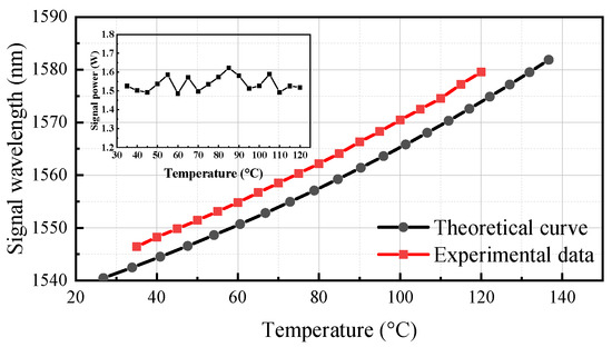Firstly, the temperature tuning characteristic of the MgO:PPLN crystal is studied without the wavelength-selecting element. In order to achieve the optimal phase matching condition, the polarization state of the pump beam is perpendicular to the optical platform by rotating the 1/2 wave plate. Under an incident pump power of 10 W, the output spectrum of the signal is measured using an AQ6370C spectrum analyzer, which has a resolution of 0.02 nm and a wavelength range of 600–1700 nm. The wavelength at the center of the FWHM is recorded as the center wavelength of the signal wave. As shown in Figure 2, when the temperature of the oven rises from 35 °C to 120 °C at intervals of 5 °C, the signal wavelength increases quasi-linearly from 1546.41 nm to 1579.57 nm with a slope of 0.4 nm/K. The typical spectral width is 0.3 nm, which fluctuates by ±0.05 nm in the temperature range from 35 °C to 120 °C. As shown in the inset of Figure 2, the average output power of the signal is 1.55 W under an incident pump power of 10 W. The power fluctuation is ±4% over the entire temperature range, which indicates that the polarization of the signal is not affected by the crystal temperature. OPO is a second-order nonlinear process involving the interaction of three optical fields, which needs to satisfy the conservation of energy and momentum: