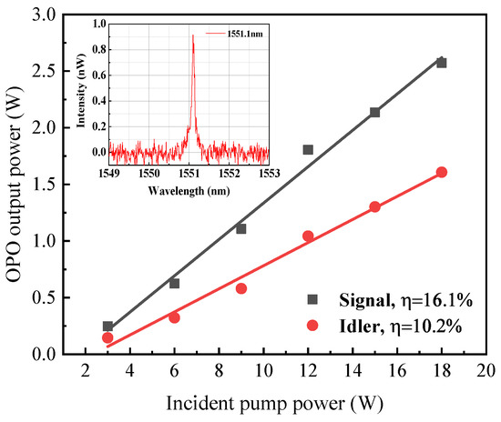 where the parameters λ, n, and Λ represent the wavelength, refractive index, and crystal poling period. The subscripts p, s, and i represent the pump light, signal light, and idler light, respectively. Herein, n is a wavelength and temperature dependent refractive index of e light, and the corresponding Sellmeier equation can be obtained from the reference [18]. A comparison of theoretical and experimental curves is plotted in Figure 2. It is found that the theoretical wavelength is ~5 nm lower than the experimental data, and similar discrepancies can be discovered in the reference [19]. There are two reasons for this phenomenon: one is that the actual temperature of the crystal may be lower than the temperature displayed on the oven because the crystal is exposed to the air, and the other is that the deflection of the crystal angle may lead to a larger actual period. According to the wavelength tuning curve, the temperature of the oven is set to 46 °C to obtain the 1.55 μm signal wavelength. Based on the AO Q-switched Nd:YAG pump source, the OPO output powers versus incident pump powers are shown in Figure 3. With the increase of the incident pump power, the OPO output powers increase almost linearly. Under the incident pump power of 18 W, the maximum signal and idler powers of 4.06 W and 2.04 W are achieved with the slope efficiencies of 23.6% and 12.3%, respectively. As shown in the inset of Figure 3, the center wavelength is 1550.5 nm with a spectral width of approximately 0.5 nm at the maximum pump power.