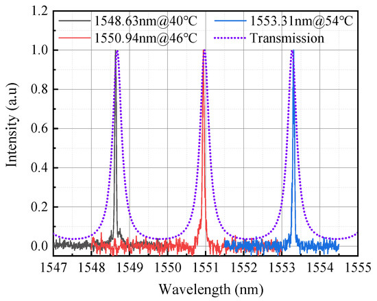 Then, inserting the F–P etalon into the cavity, a stable narrow-linewidth OPO output is achieved by optimizing the temperature of the oven. The laser output characteristics are investigated when the MgO:PPLN temperature is set to 46 ℃. As shown in Figure 4, the OPO output power linearly increases when the incident pump power exceeds 3 W. Due to the extra loss of the inserted etalon, the output power and efficiency become lower than those without the etalon. Under the incident pump power of 18 W, the maximum output powers of signal and idler waves are 2.57 W and 1.61 W, corresponding to the slope efficiencies of 16.1% and 10.2%. As shown in the inset of Figure 4, the output spectrum of the signal is measured under the maximum pump power. The center wavelength is 1551.1 nm, with a FWHM of 0.07 nm. The corresponding idler wavelength is calculated to be 3388 nm based on Equation (1). At 46 °C, the measured center wavelength fluctuation is approximately ±0.04 nm within 5 min. The instability of the signal power is approximately ±5% under the influence of the pump power fluctuations. In addition, the narrow-linewidth wavelength tuning can also be realized by changing the crystal temperature. Figure 5 shows the signal spectra at different temperatures, and the corresponding center wavelengths are 1548.63 nm @40 °C, 1550.94 nm @46 °C, and 1553.31 nm @54 °C with a FWHM of approximately 0.05 nm when the incident pump power is approximately 3 W. When the temperature is 46 °C, it can be found that with the increase of the pump power from 3 W to 18 W, the center wavelength of the signal has a red shift of 0.16 nm, which may be caused by the increase of the crystal temperature with the incident pump power. Based on the principle of multi-beam interference, the F–P etalon has different transmission for different wavelengths. As shown in Figure 5 (dotted line), the corresponding transmittance curve can be plotted using the following transmission formula [20,21]: