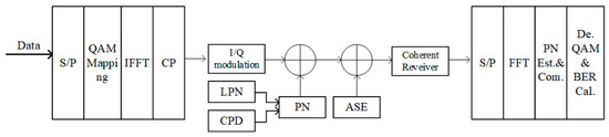 Based on Equations (1)–(3) and (10), also contains the laser phase noise and the core phase drift, with zero mean Gaussian noise. In addition, the variance in the LPN is modified as , where is the OFDM symbol duration. From this variance, the OFDM system is more sensitive to phase noise than single-carrier systems and has a great influence on the number of carriers because of the phase noise.