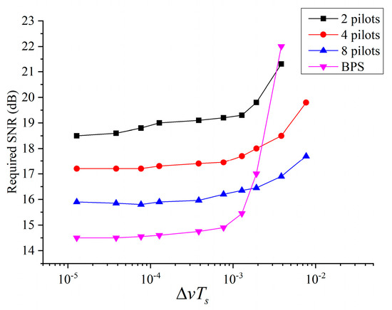 Figure 4 compares the PN compensation with PA and BPS algorithms in terms of the required SNR against the normalized linewidth (NLW) containing laser phase noise, with the addition of core phase drifts for 128 -subcarrier 16 QAM CO-OFDM SDM systems. The required SNRs at different NLWs are the tested SNRs when the BERs achieve 3.8 × 10−3 (7% HD-FEC threshold). Different pilots (2, 4, and 8) are input instead of the data subcarriers to estimate the phase noise. In general, CPD is about 10−3 times the LPN and is used in this section. As can be seen in Figure 4, the required SNR of BPS with the DPT algorithm is always lower than that of the PA algorithm with insert pilots. The pilots are inserted evenly in this simulation. The required SNR of BPS is about 1.4 dB, 2.7 dB, and 4 dB better than that of eight pilots, four pilots, and two pilots, respectively. The more inserted pilots there are for the PA algorithm, the better the performance of the PN compensation is (as Equation (12) shows). However, the tolerances of the PA are better than those of the BPS. For the 1 dB SNR penalty, the tolerances of the NLW are 1.5 × 10−3 and 3 × 10−3 for the BPS and PA methods. When the tolerance of NLW is reached, the performance of the BPS method decreases greatly compared with PA, which is due to the fact that the PN exceeds the tested phase of BPS.