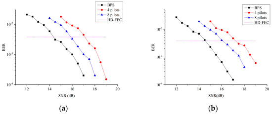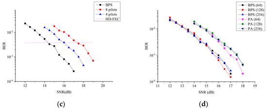 Next, we analyze the performance of the PN compensation for 16 QAM CO-OFDM SDM transmission links under different subcarriers. The BERs as a function of SNR are simulated at the same NLW of 2.56 × 10−4 for 64, 128, and 256 subcarriers. Figure 5a–c show that the PN compensation performances are almost the same under different subcarriers. When the HD-FEC threshold is achieved, the required SNRs are about 14.5 dB, 15.9 dB, and 17.3 dB for BPS, four insert pilots’ PA, and eight insert pilots’ PA, respectively. The performance of BPS is better than that of PA (about 1.4 dB for eight insert pilots and 3 dB for four insert pilots) for random subcarriers. The results indicate that the PN compensation performance mainly depends on the PNE algorithm and is little affected by the number of subcarriers. In order to deeply analyze the influence of the subcarriers on the PN compensation, BERs as a function of SNR under different carriers are demonstrated with BPS and PA with eight insert pilots. The required SNR for different subcarriers is almost the same (less than 0.1 dB) at the HD-FEC. Thus, the BPS-DPT with the 32-test-phase algorithm has a better performance compared with the PA algorithm. Additionally, the performance under the same NLW is almost the same under different subcarriers with the same PNE algorithm.