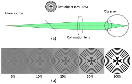 (a) Schematic of the experimental optical bench. (b) Test visual stimulus for different Michelson contrast levels and constant spatially averaged luminance.