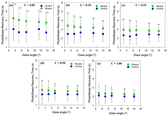 PSRT as a function of the angle of the glare source for each stimulus contrast for myopic (green dots) and control groups (blue dots); (a): C = 0.05; (b): C = 0.10; (c): C = 0.25; (d): C = 0.50 and (e): C = 1.00. Error bars represent 1 standard deviation. A single asterisk sign (*) was plotted to indicate that statistically significant differences (p value < 0.05) for PSRT values between groups were found. A double asterisk (**) was plotted to point out the significant differences complying with Bonferroni’s correction (p value < 0.001).