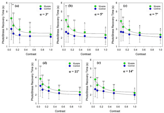 PSRT as a function of the stimulus contrast for each incident angle of the glare source for myopic (green dots) and control groups (blue dots); (a): α = 3º; (b): α = 5º; (c): α = 7º; (d): α = 11º and (e): α = 14º. The black lines through the dots are non-linear exponential decay regressions fitted to the values. Error bars represent 1 standard deviation. A single asterisk sign (*) was plotted to indicate that statistically significant differences (p value < 0.05) for PSRT values between groups were found. A double asterisk sign (**) was plotted to point out the significant differences complying with Bonferroni’s correction (p value < 0.001).