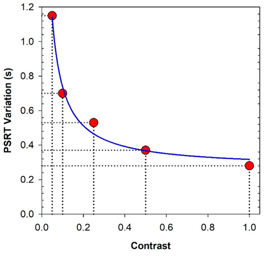 PSRT variation (difference mean PSRT values for all glare angles between myopic and control eyes) as a function of the stimuli contrast. The blue line represents the non-linear regression of the plotted data.