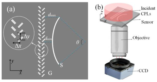 (a) Structure diagram of the designed plasmonic sensor at x−y plane, two parallel columns of spatially arranged rectangular nanogrooves (named ‘G’) and a micron length circular arc slit (named ‘S’) are etched into a thin silver film with thickness of 150 nm, Δx = 0.153 μm, Δy = 0.2 μm, dmin = 0.9 μm, dmax = 1.9 μm, θ = 40°. (b) Schematic diagram of a reference functional testing optical path for detecting the chirality of the incident CPLs in the actual experiment.