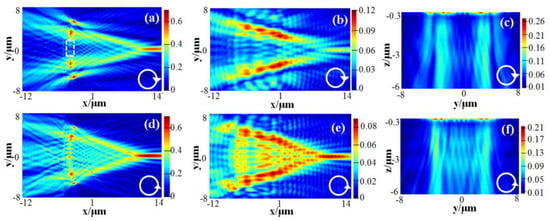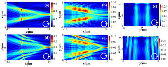 The simulated results of the (a) near field at zo = −200 nm and (b) far field at zo = −6 μm electric field light intensity distributions generated by the sensor for the case of right−hand CPL incidence. The simulated results of the (d) near field at zo = −200 nm and (e) far field at zo = −6 μm electric field light intensity distributions for the case of of left−hand CPL incidence. (c,f) show the electric field light intensity distribution at y−z plane (i.e., x = 0 μm, −6 μm ≤ z ≤ −0.3 μm) of the cases of (a,b) and (d,e), respectively. The amplitude of the incident light is set to 1.
