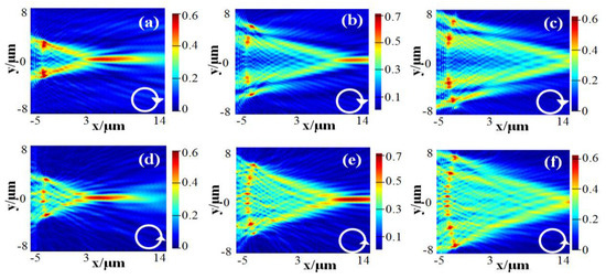 The influences of the radius R of the ‘S’ on the transmitted electric field light intensity distributions are also discussed, when the incident light is a collimated right-handed CPL. Figure 4 shows the simulated results of the influence of the radius R of the ‘S’ on the transmitted light intensity distributions for the cases of (a)(d) Rout = 9 μm, (b)(e) Rout = 16 μm and (c)(f) Rout = 21 μm. Among them, (a)(b)(c) denote the simulated results for right-handed CPL incidence; (d)(e)(f) denote the simulated results for left-handed CPL incidence. In Figure 4, only the simulated results of the near-field light intensity distributions are given. The corresponding simulated results of the far-field light intensity distributions are not given, as they have the same characteristics as the near field. In the simulation experiment, the central angles corresponding to the three circular arc slits with different radii are equal, that is, θ = 40°. The minimum spacing between the right edge of ‘G’ and the left edge of ‘S’ also remains unchanged, which is dmin = 0.9 μm. Therefore, when the radius R of the ‘S’ changes, the position of the center of the circular arc slit will simultaneously change. It can be seen from Figure 4a–c that, for the case of right-handed CPL incidence, the larger the radius R is, the more interference orders k are included in the light intensity distributions. At the same time, the larger the radius R is, the larger the dark area of the corresponding ‘2D hollow cone’. Hence, in order to increase the dark area of the ‘2D hollow cone’, the radius of the circular arc slit can be appropriately increased. In contrast, it can be seen from Figure 4d–f that, for the case of left-handed CPL incidence, the larger the radius R is, the larger the area of the ‘2D solid cone’. A concentrated light field intensity distribution will always be formed.