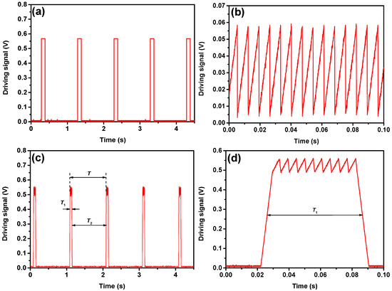 Figure 4c shows an intermittent scanning technique combining pulse mode and conventional direct absorption technology. In this technique, the driving signal consists of “working state T1” and “resting state T2”. When the driving signal is in the “working state T1”, the soft start circuit gradually increases the current signal to make it exceed the laser threshold, and then superimposes the sawtooth wave signal to achieve continuous scanning of the output wavelength. The corresponding driving signal is used to drive the QCL source as shown in Figure 4d. When the “working state T1” is completed, the soft shutdown circuit makes the current signal gradually reduce to zero, and the QCL is in the “resting state T2”, which greatly reduces the power consumption of QCL. The heat generated by the QCL in the “working state T1” can be lost during the “resting state T2”. The duty cycle of the driving signal in the “working state T1” and “resting state T2” can be automatically adjusted and optimized by monitoring the real-time temperature of the QCL, so that the QCL can be kept in a thermally balanced working state. Therefore, the sensor does not need a heat dissipation device, which reduces the power consumption and size of the sensor. Compared with the conventional direct absorption technology, the power consumption of the sensor in the intermittent scanning technique is reduced by 75%, about 1.08 W.