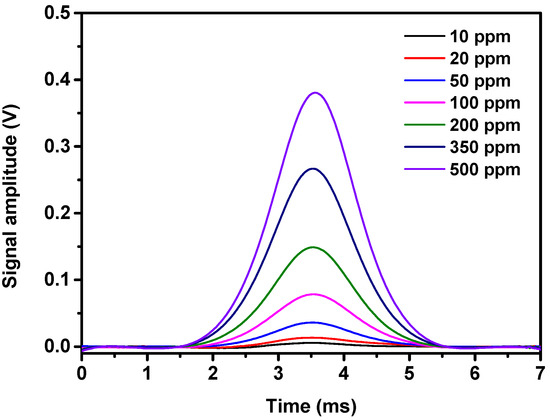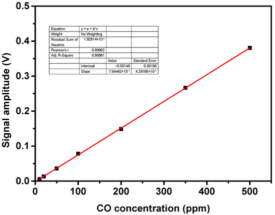 The signal amplitude as a function of CO concentration ranging from 10 ppm to 500 ppm is plotted in Figure 6. The calculated R-square value is 0.9998 in this CO sensor, which indicates that the response signal has an excellent linear response to the CO gas concentration.