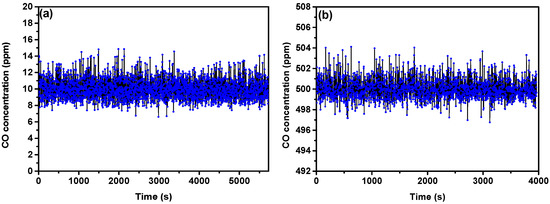 In order to confirm the stability of our CO sensor, a long-term detection experiment of the sensor response to 10 ppm and 500 ppm CO concentration was carried out. Measured signal amplitude changes of CO over 1 h are shown in Figure 7. It is observed that the signal amplitude of CO is comparatively steady during this period. The concentration fluctuation is only about 4 ppm. These measurements show that our sensor can detect CO with high stability. The main reasons for the signal fluctuations include the drifts of the QCL wavelength and power, the noise caused by the self-made circuit, instability of the detector in long-term operation, optical fringes, etc.