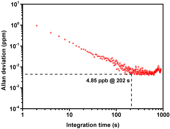 Finally, to evaluate the performance of the compact and low-power-consumption CO sensor, an Allan deviation analysis was computed when 99.9% N2 gas was injected into the CO sensor. Figure 8 shows the Allan deviation analysis results of the CO sensor, where the integration time varies from 1 s to 200 s. The Allan deviation follows a dependence, which indicates that the main noise of the compact and low-power-consumption CO sensor is white noise [34]. When the integration time is 202 s, a minimum detection limit of 4.85 ppb is achieved.