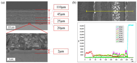 The experimental materials were Boeing 737 aircraft skins with coatings. As shown in Figure 1, a field emission scanning electron microscope (FE-SEM, ZEISS SUPRA® 55, ZEISS, Germany) with energy dispersive spectroscopy (EDS) attachment was used for cross-section observation and energy spectrum analysis of the original sample. As presented in Figure 1a, there are four layers of paint on the aluminum substrate, with a total thickness of about 200 μm, which are coated alternately by polyurethane paint and epoxy paint. The substrate is A357 Al alloy, and there is a uniform anodic oxide film about 2 μm thick between the paint and the aluminum substrate. It can be seen from the energy spectrum results in Figure 1b that all elements content of different paint is obviously differentiated, according to which the paint can be clearly layered.