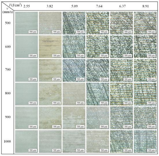 Macro morphology of aircraft skin surfaces after laser cleaning with different laser fluences and scanning speeds.