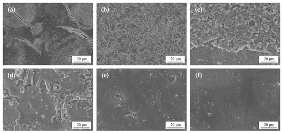 According to the abovementioned research results, five representative samples were selected for further comparative analysis with the original sample. The process parameters used for cleaning the samples are listed in Table 3. Figure 4 shows the micromorphology of the uncleaned and laser-cleaned aircraft skin surface obtained by SEM. It can be seen from Figure 4a that white areas were distributed on the untreated surface of sample 1, and fine cracks appeared in and around the white areas, which is due to the damage of the paint in the harsh environment during the service of the aircraft skin. After laser cleaning, the paint on the surface of sample 2 in Figure 4b still covered the entire substrate surface, and dense ablative pits appeared on the surface. With the increase of laser energy, a small part of substrate was exposed on the surface of sample 3 in Figure 4c. As the paint kept thinning under the action of the laser, the texture of the metal substrate began to appear on the surface, and it can be seen that there was an obvious demarcation line between the paint and the substrate. Figure 4d displays that almost of the paint on the surface of sample 4 was removed and exposed a large area of the substrate, with a smattering paint and oxide film remaining on the surface that were closely attached to the substrate. The paint on the surface of sample 5 was completely removed, while the texture on the surface of the substrate was clear and densely distributed (Figure 3). At the micro-scale, the paint on the surface of sample 5 in Figure 4e was absent, and the surface became flat. When the laser energy density further increased, there were obvious oxidation streaks on the surface of sample 6, and the substrate texture became sparse and shallow (Figure 3). Meanwhile, the observation area of sample 6 in Figure 4f is flatter than that of sample 5 in Figure 4e, indicating that the substrate of sample 6 was remelted under the action of the high-energy laser. In conclusion, it can be judged that within the research scope of this article, the cleaning effect of sample 5 was the best, and the corresponding process parameters were optimal.