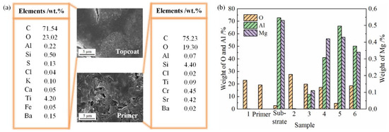 Chemical composition measurement results of sample surfaces obtained by EDS: (a) measurement results of chemical elements for topcoat and primer, (b) main characteristic chemical components of the observed samples.