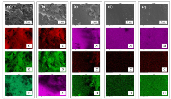 The effect of laser cleaning varied greatly under different process parameters. EDS was used to analyze the elemental composition of the sample surfaces, and the measurement results are exhibited in Figure 5. For comparison with the changes of elements on the sample surfaces after laser cleaning, Figure 5a displays the chemical composition of the topcoat and primer. The main characteristic chemical components of the analyzed samples are shown in Figure 5b, where the Al alloy was acquired by mechanical rubbing of the original sample. Figure 6 presents the distribution diagrams of the first three elements with a large atomic percentage. The exposed paint of sample 2 was topcoat. Comparing the EDS results of sample 1 and sample 2 in Figure 5b, it can be found that there was little difference in weight of the elements. Through the morphology observation, the residual substances on the surface of sample 3 were primer and oxide film. Upon comparison with the EDS results of the primer, the changes were a significant increase in the content of Al to 11.76% and the presence of Mg elements at 0.11%. Furthermore, in Figure 6b, the content of Al element was greater, which was distributed in the lower left of sample 3 surface, which proves that the lower-left area of the surface was Al alloy substrate. The substances remaining on the surface of sample 4 were the primer and oxide film as those on sample 3. Compared with sample 3, the content of Al and Mg increased greatly, indicating that the Al alloy substrate accounted for a larger proportion in the surface-measurement area and less primer remained on the surface. From the Al element distribution diagram, the Al element was mainly distributed in the left half of the surface (Figure 6c). The EDS results of sample 5 suggest that the elements of the paint almost disappeared (Figure 5a), but a very small amount of paint splashed during the cleaning process and remained on the surface. The Al content of sample 5 increased significantly relative to that of sample 4 (Figure 5b) and was evenly distributed on the entire surface (Figure 6d), revealing that the paint had been completely removed and the substrate was fully exposed. The EDS comparison results between sample 5 and Al alloy substrate displayed that the content of O in sample 5 increased by 1.79%, while the content of Al and Mg elements decreased by 6.65% and 0.1%, respectively. It can be concluded that the surface of sample 5 was inevitably affected by laser heat accumulation, resulting in slight oxidation. In Figure 6e, the elements of Al and O were uniformly distributed on the surface of sample 6, indicating that the paint was thoroughly stripped. Nevertheless, according to the EDS results of sample 6, compared with sample 5, the content of O was further increased to 18.54%, while the elements of Al and Mg both decreased slightly, which proves that the thermal oxidation degree was higher. The above results can demonstrate that the cleaning effect of sample 5 was optimum, which is consistent with the results obtained from the microscopic characterization.