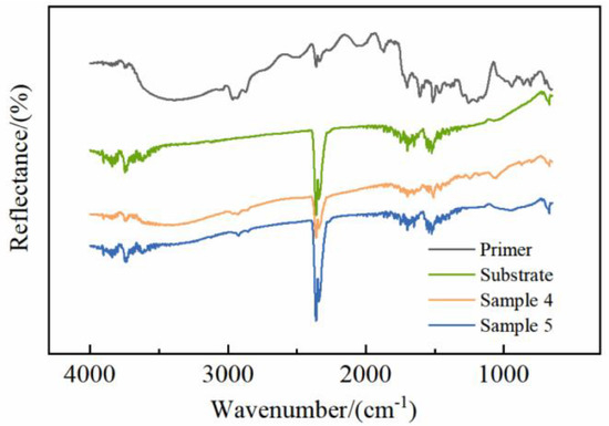 FTIR spectroscopy of primer, substrate, and laser-cleaned sample 4 and sample 5.