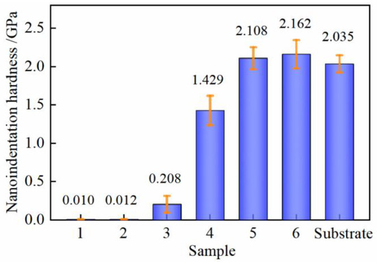 The change of surface microstructure caused by laser interaction with the sample may have an impact on the mechanical properties of Al alloy substrate [43,44,45], which needs further study. The nanoindentation hardness of laser-cleaned samples and Al alloy substrate obtained by mechanical lapping is shown in Figure 8. The paint exposed on the surfaces of sample 1 and sample 2 is both topcoat and fully covered the substrate, so the difference in hardness between the two samples was minimal, and the hardness values were very small. For sample 3, the paint adhered to majority of the Al alloy substrate, and the exposure of a small portion of the substrate resulted in an increase in hardness relative to sample 1 and sample 2. The hardness of Al alloy was greater than that of primer, so the hardness of sample 4, which exposes most of the substrate, greatly increased concerning that of sample 3. It should be noted that the uneven distribution of paint on the surfaces of sample 3 and sample 4 led to different microhardnesses at different positions, thereby resulting in a larger standard deviation of the microhardness. The paint of sample 5 and sample 6 was entirely stripped, and the hardness increased by 0.679 GPa and 0.733 GPa, respectively, compared with that of sample 4. The hardness of samples 5 and 6 increased by 3.587% and 6.241%, respectively, with respect to the substrate, indicating the formation of a hardened layer on the sample surface after laser cleaning.