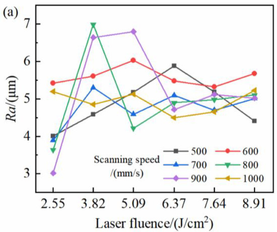 Ra is a considerable performance index of the quality of the machined surface, which reflects the micro-geometric error of the part surface, and greatly affects the working accuracy, corrosion resistance, and wear resistance of the parts [46,47,48]. H can directly represent the degree of laser cleaning. The Ra and H of the aircraft skin surface after laser cleaning at different process parameters are described in Figure 9 and analyzed in combination with Figure 3. When the laser fluence was 2.55 J/cm2, the laser energy was not great enough to peel off the thick topcoat at all scanning speeds within the range of research parameters, and H was small; thus, the exposed paint on the surfaces of the cleaned samples was still the topcoat that completely covered the samples. When the laser fluence increased to 3.82 J/cm2, the energy acting on the surface of the sample increased, and multiple layers of paints were exposed on the surface at the same time, resulting in a corresponding increase of Ra and H relative to that of the sample with the laser fluence of 2.55 J/cm2. When the laser fluences were 5.09–6.37 J/cm2, the paint of some samples was completely removed, the substrate texture was obvious, and the variation of the surface profile changed more greatly compared with that of the laser fluence of 2.55 J/cm2, so Ra increased and H reached the maximum. As the laser fluence continued to increase, the substrate texture of some samples became shallow or even disappeared. At this time, the surfaces were remelted and relatively flat, but the laser action time was so short that H did not change significantly. Form the whole, the surfaces of the samples that had not completely removed the paint and oxide film exposed a variety of objects to be cleaned at the same time, which were unevenly distributed on the substrate, and the edge of the residual paint layer on some surfaces was tilted. The surface morphology is complex, and the contour fluctuated greatly, so Ra changed in a large range. The surface morphology of the samples with the substrate completely exposed was affected by the substrate texture and laser ablation traces; Ra fluctuated slightly within a certain range. The change of H was relatively regular, which increased with the increase of laser fluence and the decrease of scanning speed. When the paint and oxide film were completely stripped, the changes of process parameters within the studied range did not cause a significant change in H. It is appropriate to evaluate the cleaning effect in consideration of the variation in Ra and H.