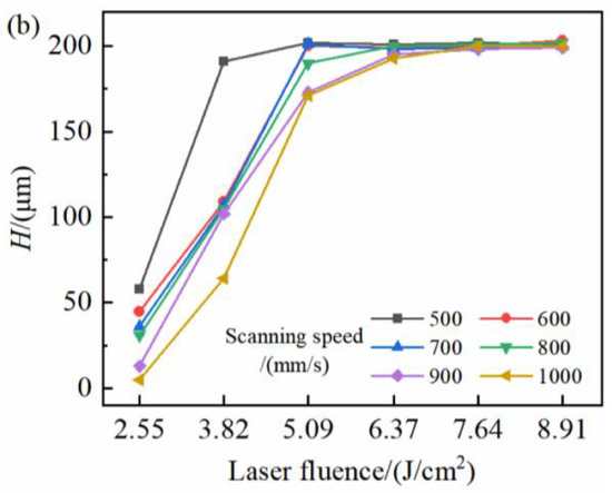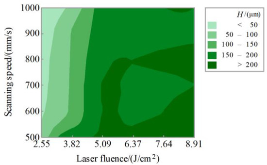 Analysis of variance was used to test the significance of the process parameters to the response [49,50]. Table 4 shows the results of the analysis of variance, and the p-value represents the degree of significance. For Ra, the p-value of the laser fluence was less than 0.05, and the p-value of the scanning speed was greater than 0.05, indicating that within the parameters of this study, laser fluence had a significant effect on Ra, while scanning speed had no significant effect on Ra. For H, the p-values of laser fluence and the scanning speed were both less than 0.05, signifying that the two process parameters had significant effects on H. To compare the degree of influence of laser fluence and scanning speed on H, the main effects analysis of H was carried out [51], and the results are shown in Figure 10. The lines drawn by the mean value of H at different levels of process parameters were not parallel to the X-axis, meaning that different levels of process parameters had different effects on H, and the fluctuation of laser fluence was significantly greater than that of scanning speed, so the influence of laser fluence on H was greater than that of scanning speed. Figure 11 draws the contour plot of H, which can intuitively observe the relationship between the response and the process parameters. Due to the thickness error during the painting process, the H of paint and the completely removed oxide film samples fluctuated around 200~202 µm. Within the parameters studied in this paper, the H of the samples with the substances completely removed from the substrate surface was mainly concentrated in the medium and high values of the laser fluence and the medium and low values of the scanning speed, but excessive laser fluence or too-small scanning speeds may cause serious oxidation of the substrate. Therefore, it is recommended to choose parameters in the middle region of laser fluence and scanning speed for laser paint stripping within the studied parameters.