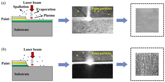 Laser-cleaning technology is able to remove different substances from the surface of a variety of substrates and has become an environmentally friendly and advanced cleaning technology. Laser-cleaning processes are complex and varied. The bond or bonding force between the removed material and the substrate is destroyed through the action of light or heat, and the contaminants on the surface of substrate are removed by the physical and chemical reactions such as vaporization, thermal decomposition, vibration, and phase explosion [9,52,53]. For laser paint stripping, after the laser irradiates the paint surface, the paint absorbs the laser energy, then the temperature of the surface rises instantly, and the paint is thermally decomposed. When the temperature reaches and exceeds the boiling point of the paint, the paint will be vaporized. In the meantime, plasma is generated on the surface at a high temperature, and the plasma shock wave breaks the paint into pieces and ejects them into the air. Figure 12 describes the main schematic diagram of the laser paint-stripping mechanisms. The combined effect of multiple mechanisms eventually caused the paint layer to break away from the substrate. As shown in Figure 12a, the laser energy was low, part of the paint acted with the laser, and the ablation flame was obvious. As can be seen from Figure 12b, all the paint was affected by the laser under the action of high laser energy, the plasma cloud became larger, and the plasma-shock effect was notable. Furthermore, the tiny paint particles spattered were captured by the high-speed camera. The results showed that the cleaning mechanisms involved in laser paint stripping mainly included thermal decomposition, vaporization, and spallation.