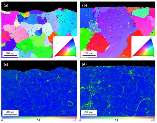 EBSD analysis for the cross-sections of samples after mechanical lapping and laser cleaning were performed to observe the changes in the substrate grains. Figure 13 expresses the inverse pole figure (IPF) mappings and local misorientation (LM) mappings of the samples after mechanical lapping and laser cleaning. Comparing the IPF maps of the two samples in Figure 13a,b, grain refinement was not detected on the laser-cleaned surface, but an obvious color variation within the grains was observed on the near-surface after laser cleaning, indicating that the laser caused in the deformation of the grains. The LM maps of Figure 13c,d calculate the average dislocation between the target point and all its neighbors, characterizing the internal microstructure evolution. The LM of the laser-cleaned near-surface was significantly greater than that after mechanical treatment, and the LM distribution inside the grains of the samples after laser cleaning was evident, which further proves that laser cleaning induced obvious plastic deformation, thereby increasing the LM density. The surface microhardness of the sample with the paint completely removed by laser cleaning was higher than that of the sample with the paint completely removed by mechanical lapping, which can be attributed to the plastic deformation of the near-surface of the substrate caused by the shock wave generated during the laser paint stripping, resulting in strain hardening [37,54,55].