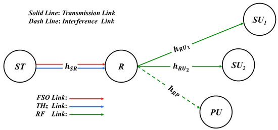 The CR model comprises an ST, an R, two SUs, and a PU. Within the SN, the ST employs soft-switching FSO/THz links to propagate signals to R. As shown in Figure 1, R takes control of the spectrum band belonging to the PN using the CR and transmits signals to the two SUs via the AF-NOMA RF link. Without loss of generality, the channel gains are assumed to be according to the inverse of the link distance because the greater the distance traveled, the greater the attenuation by atmospheric turbulence.