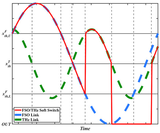 Deriving the CDF of soft-switching FSO/THz-RF based on the CDF above for each link, the upper threshold and the lower threshold are set for the FSO link, and there is only one threshold, , for the THz link, which is depicted in Figure 2 [31].