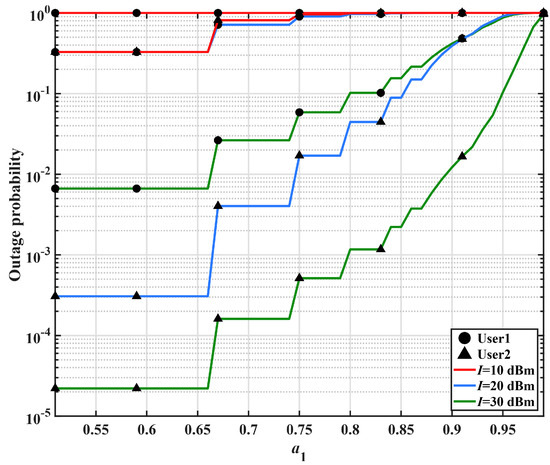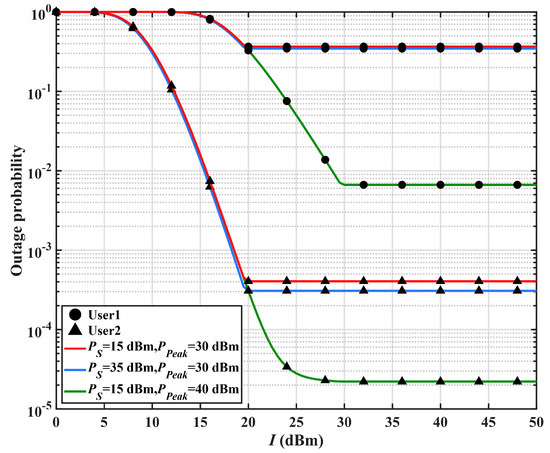 In Figure 4, numerous deductions may be discerned. Firstly, with the elevation of I, the link’s performance exhibits enhancement. Nevertheless, owing to the constraints imposed by both I and upon , the link’s performance reaches a state of equilibrium at a specific I, as determined by (13). Furthermore, it is noteworthy that augmenting both and can amplify the link’s performance, albeit the enhancement brought about by increasing is notably more pronounced. This discrepancy arises from the operation of the link using AF-NOMA, wherein contends with more extended link distances compared to . Consequently, for the ensuing analysis, we establish dBm and dBm.